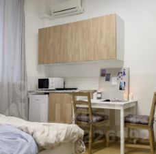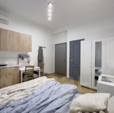 Пространство компактное, но функциональное и полностью автономное. В комнате оборудована собственная мини-кухня с электрической плитой, холодильником, микроволновой печью и чайником, есть необходимая посуда. Установлены деревянный стол и стулья, кондиционер, удобная кровать, шкаф и комод для хранения, а также зеркало в полный рост. Студия закрывается на ключ. Внутри расположен совмещенный санузел с душем и туалетом.
