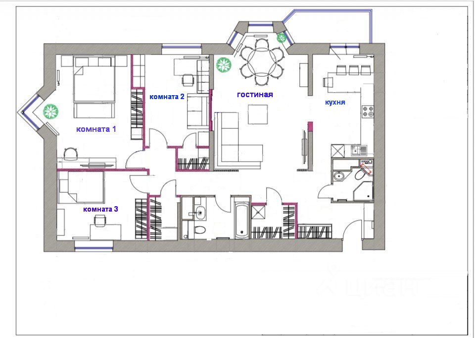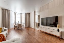 Функциональная планировка: просторная кухня - гостиная со столовой зоной и выходом на большую лоджию, три изолированные комнаты, два санузла (общий с ванной, и гостевой с душевой кабиной), вместительная гардеробная, постирочная.