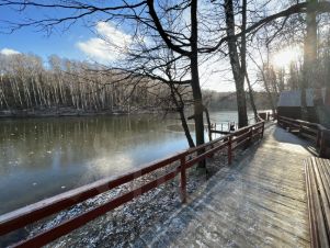 Через дорогу большой парк с беговыми дорожками, детскими площадками, кафе, озером и пляжной зоной.