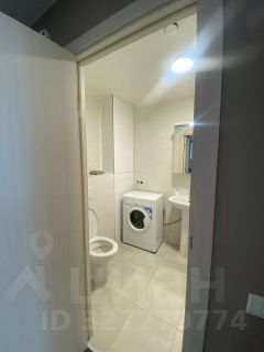 Совмещенный санузел оборудован ванной и стиральной машиной.