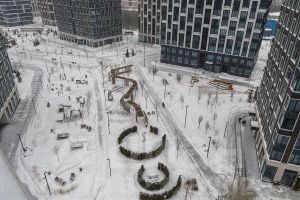 Территория комплекса оформлена как большой парк с зонами отдыха, детскими площадками и прогулочным бульваром.