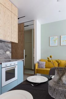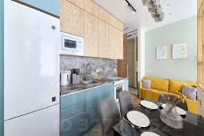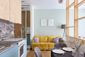 - просторная кухня-гостиная с обеденной зоной и зоной для отдыха с ТВ