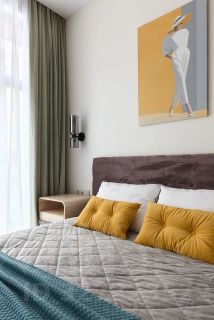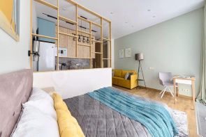 - изолированная спальня с большой кроватью, системой хранения и рабочим пространством