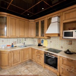 Просторная кухня организована как полноценная обеденная зона и оснащена всей необходимой бытовой техникой для приготовления пищи: духовой шкаф, посудомоечная машина, микроволновая печь, вытяжка, холодильник и электрический чайник. В наличии комплект посуды.