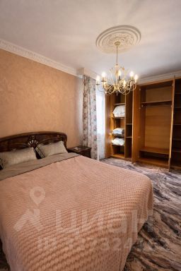 В спальне — широкая двуспальная кровать, вместительный платяной шкаф и телевизор; имеется выход на лоджию.