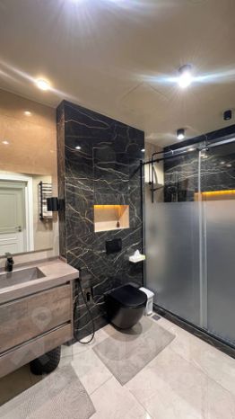 В квартире сделан дизайнерский ремонт, который порадует вас стильными решениями и уютной атмосферой. Обширная кухня площадью 25 кв. м оборудована всей необходимой техникой: холодильник, посудомоечная машина и стиральная машина. В комнатах и на кухне есть мебель, что позволяет сразу переехать и наслаждаться комфортом. В квартире два отдельных санузла, в которых установлены душевые кабины. Окна выходят как на улицу, так и во двор, поэтому в квартире всегда светло и тихо. Есть кондиционер и телевизор.