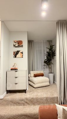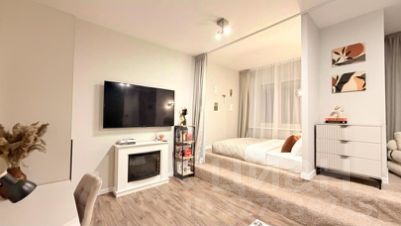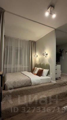 В спальной комнате кровать расположена на стильном подиуме, создающем атмосферу уюта и приватности. Декоративный камин добавляет интерьеру тепла и шарма. Здесь же находятся раскладное кресло и диван, что позволяет комфортно разместить большую компанию. Всего в квартире предусмотрено достаточное количество спальных мест — с удобством смогут остановиться до 7 взрослых гостей.