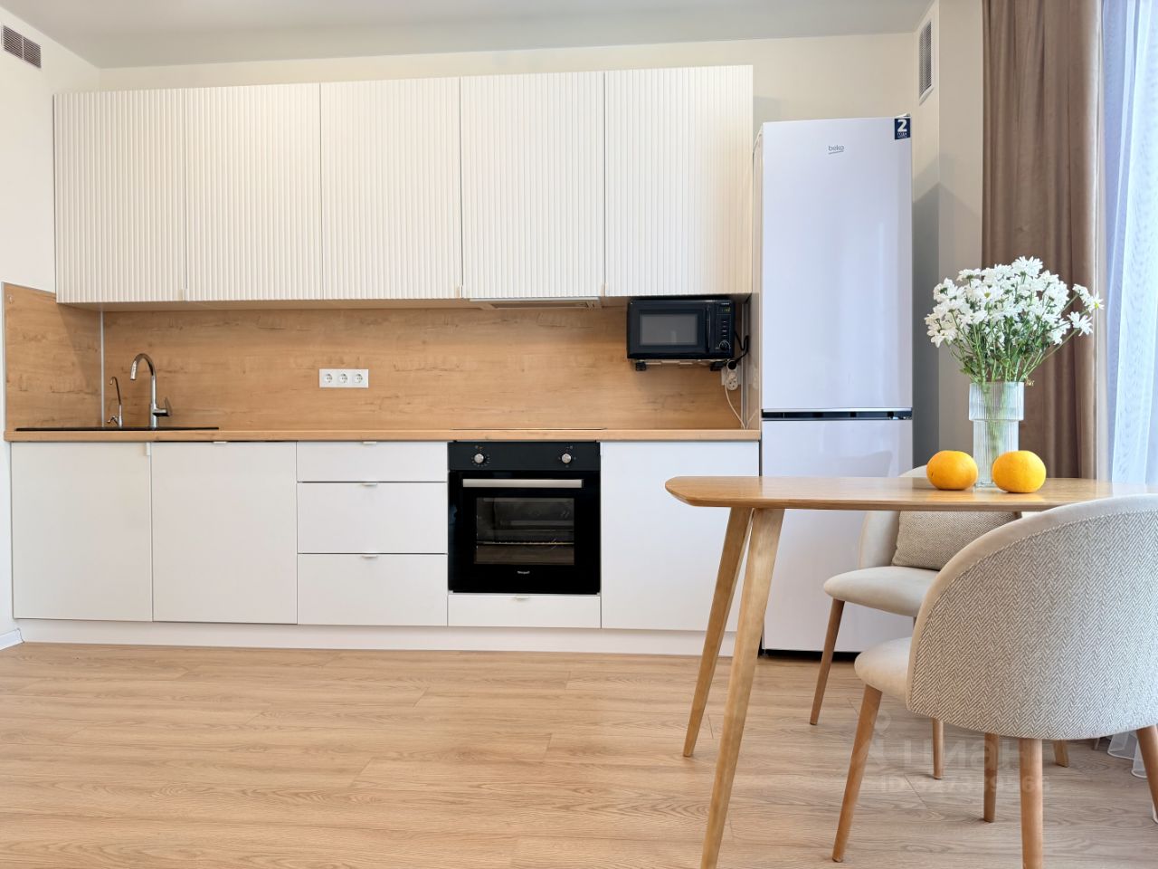 Квартира укомплектована всей необходимой бытовой техникой: холодильник, варочная поверхность, духовой шкаф, посудомойка, микроволновая печь, стиральная машина.