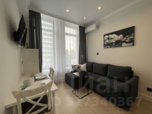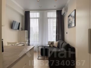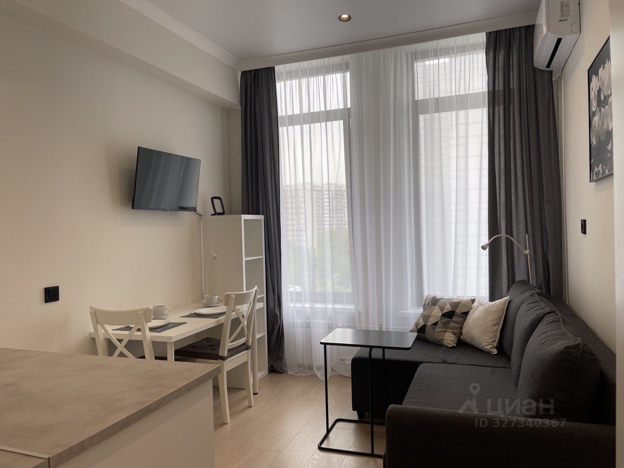 Студия выполнена в современном стиле, с высокими потолками и большими панорамными окнами.