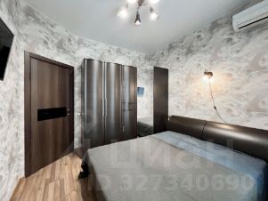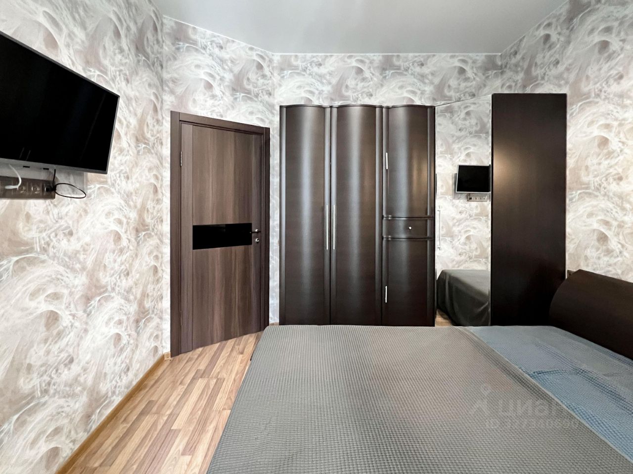 Отдельная спальня оснащена большим шкафом-купе темно-коричневого цвета с зеркальными дверцами. На стене закреплен телевизор. Пол покрыт качественным ламинатом. Стены оформлены текстурными обоями с объемным рисунком.