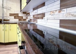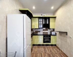 Кухонный гарнитур выполнен в ярких лимонно-зеленых тонах с контрастными черными столешницами. Установлена встроенная техника: духовой шкаф, посудомоечная машина, микроволновая печь, вытяжка. В комплекте полноразмерный холодильник. Фартук выполнен из стильной плитки с имитацией кирпичной кладки.
