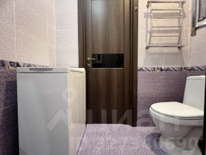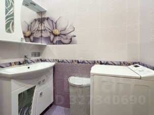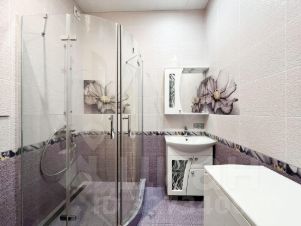 Ванная комната оборудована современной душевой кабиной со стеклянными дверцами, раковиной с тумбой и зеркалом, стиральной машиной. Стены декорированы плиткой с цветочным орнаментом в фиолетовых тонах. Установлен дополнительный шкафчик для хранения.