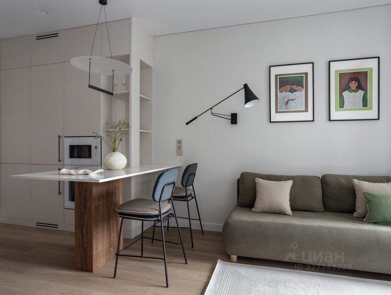 Евро-двушка: кухня-гостиная с прихожей, спальня с рабочей зоной и гардеробной, совместный санузел с ванной и теплым полом.