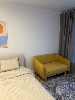Квартира сдается впервые, вся мебель и техника новые. Установлен кондиционер, холодильник, посудомоечная и стиральная машины, а также смарт-телевизор 65", гардеробная зона, двуспальная кровать, ортопедический матрас, система защиты от протечек Neptun.