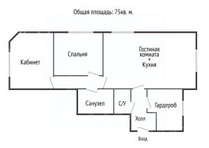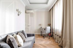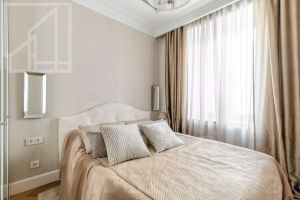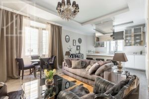 Планировка: просторная кухня-гостиная с обеденной зоной и камином, спальня, жилая комната (можно использовать как спальню или кабинет), совмещенный санузел с душевой кабиной, гостевой санузел, гардеробная комната, прихожая. Квартира оборудована бытовой техникой Miele и укомплектована мягкой дизайнерской мебелью.