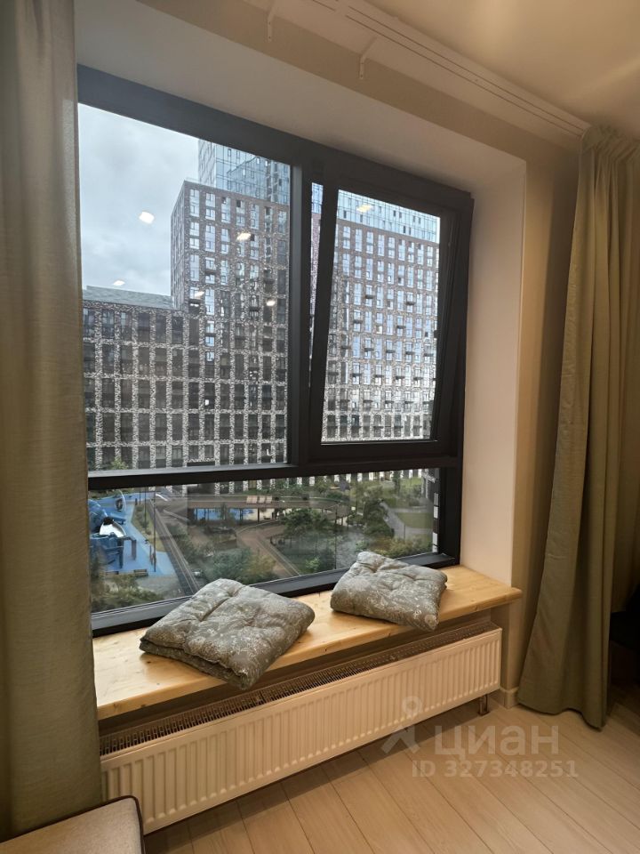 Интерьер выполнен в спокойных природных тонах. Изюминкой этой прекрасной студии является подоконник из натуральной сосны, оформленный как дополнительное уютное место для чтения любимой книги или приятного ритуала встречи нового дня с утренней чашечкой кофе.