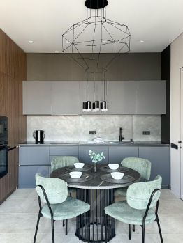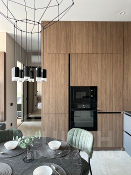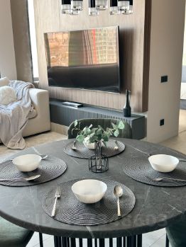 - обустроенная кухня-гостиная (кухонный гарнитур, холодильник, духовка, печь СВЧ, посудомоечная машина, чайник, стол и мягкие стулья, удобный диван, телевизор с тумбой);