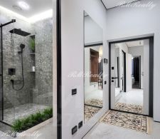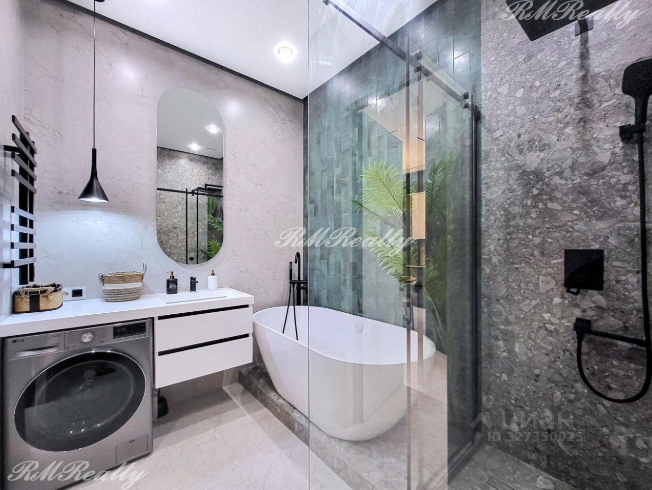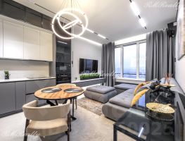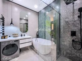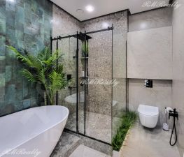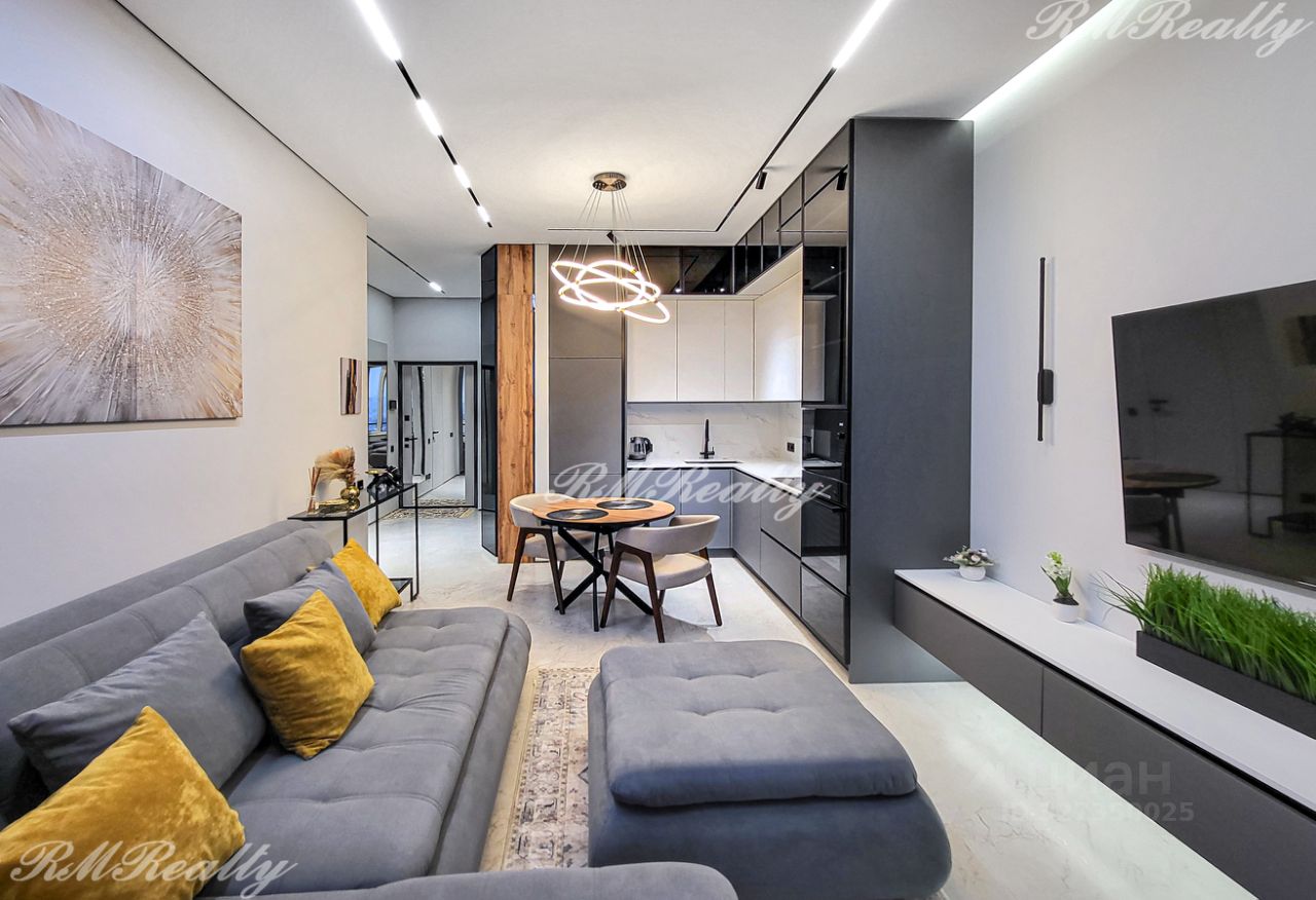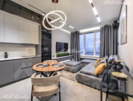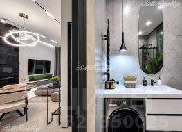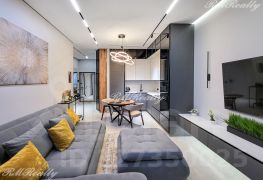 Просторная кухня гостиная, спальня с гардеробной, санузел с ванной и душевой кабиной, гардероб при входе, наличие всей необходимой техники и кондиционеров.
