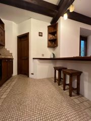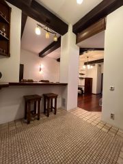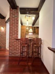 В гостиной: барная стойка (обеденная зона), стулья, двуспальный диван, ЖК ТВ.