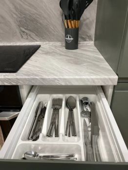 оборудованная кухня с необходимым набором кастрюль, посуды и столовых приборов (полноценный холодильник, микроволновая печь, индукционная плита, посудомойка, духовой шкаф, чайник, кофе-машина, фильтр для воды