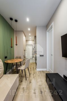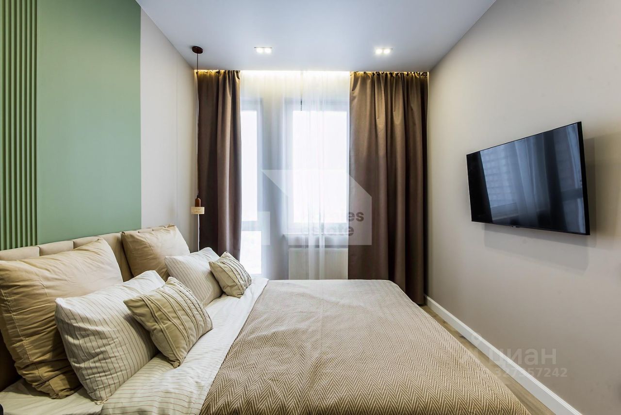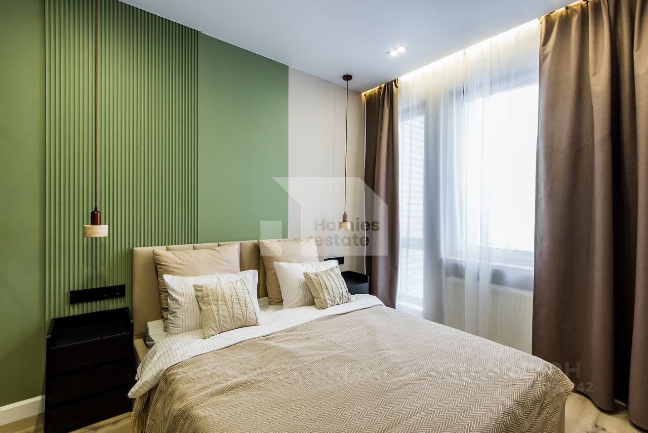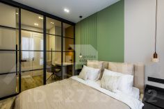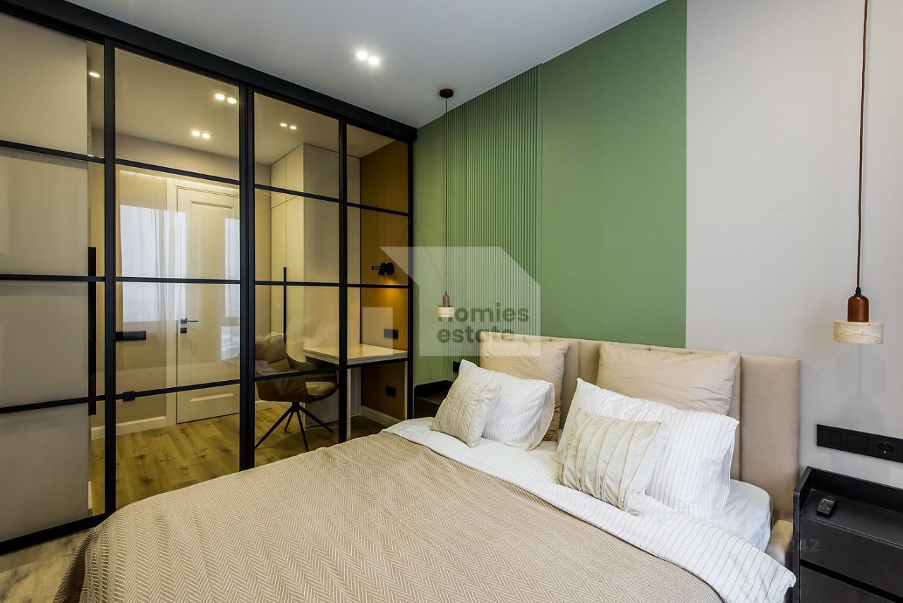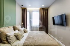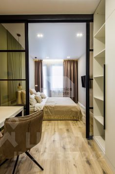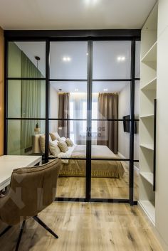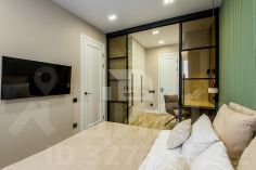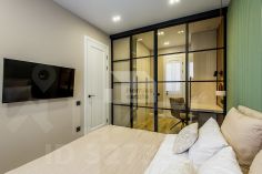 Мастер-спальня с гардеробной, рабочим столом и санузлом (в апартаментах два санузла с гостевым). Теплые полы, различные сценарии освещения, вся корпусная мебель и кухня в потолок, много зон хранения, проточный водонагреватель.