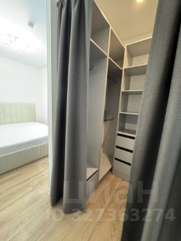 В спальне имеется отдельная вместительная гардеробная, кровать 160*200 с подъёмным механизмом, шторы 100% блекаут, TV, светильник LED c пультом управления.