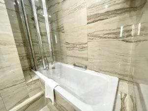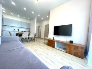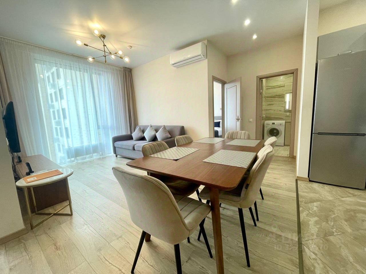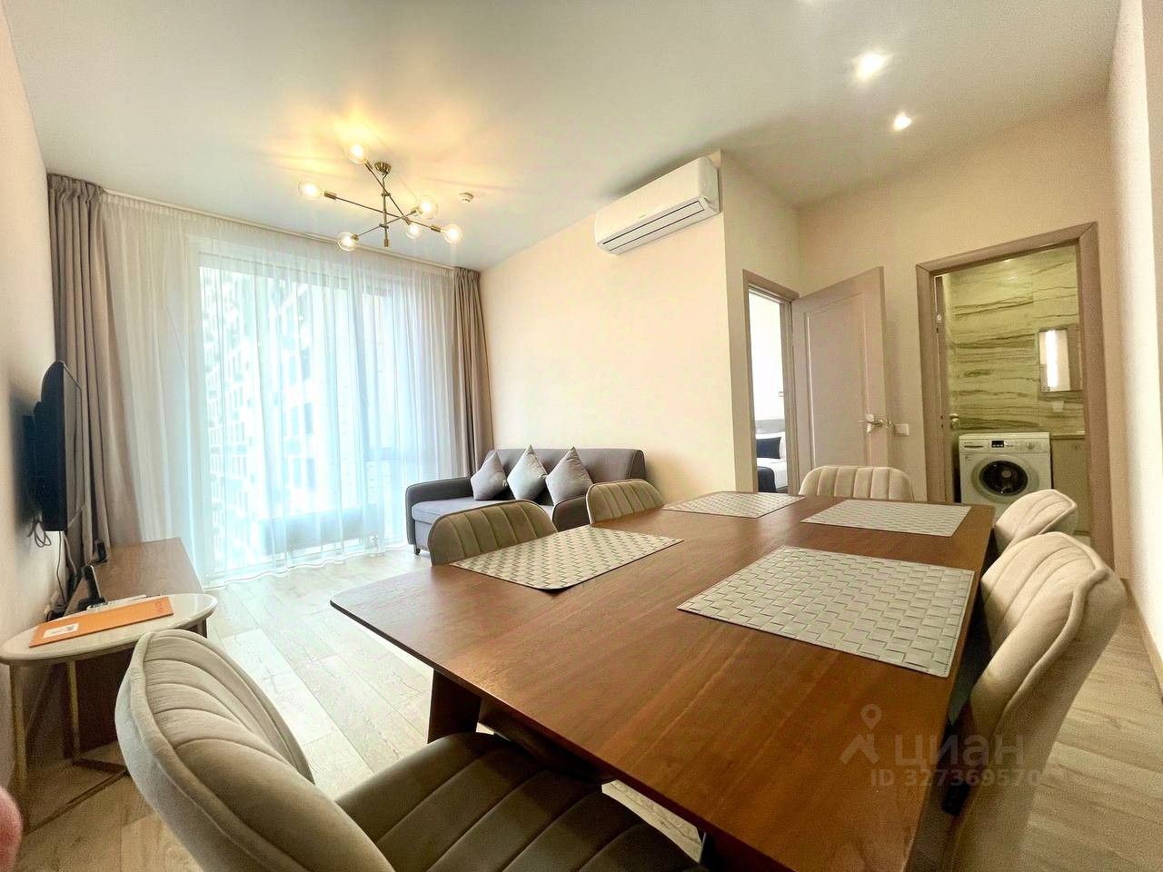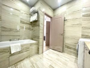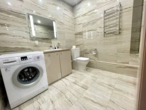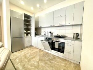 В квартире сделан современный евроремонт. Есть вся необходимая мебель на кухне и в комнате. Из техники: кондиционер, холодильник, телевизор, стиральная и посудомоечная машины. Планировка включает совмещённый и отдельный санузлы