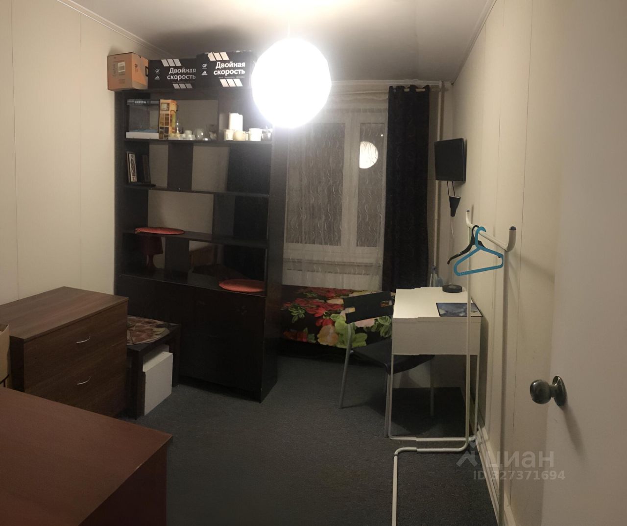 В комнате односпальная кровать с ортопедическим матрасом, шкаф, телевизор, напольная вешалка, стол со стулом, комод, тумба у кровати.