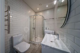 В квартире один совмещенный санузел с душевой кабиной, раковиной, зеркалом с подсветкой и стиральной машиной.