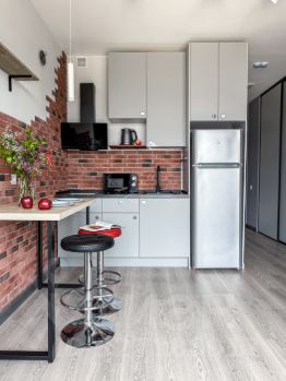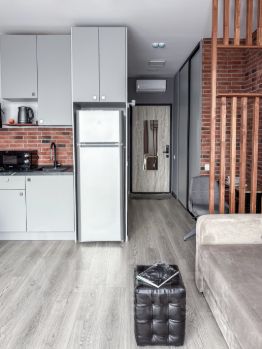 Бытовая техника: холодильник, варочная панель, СВЧ печь, эл. чайник,телевизор, кондиционер, стиральная машина.