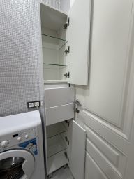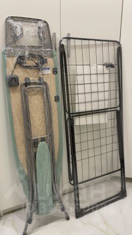 - кухонный гарнитур со встроенной техникой: индукционная плита, духовка, чайник, микроволновка, большой холодильник 2 метра, стиральная машинка, гладильная доска, сушилка,