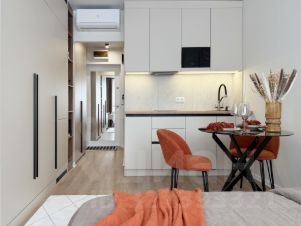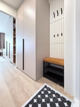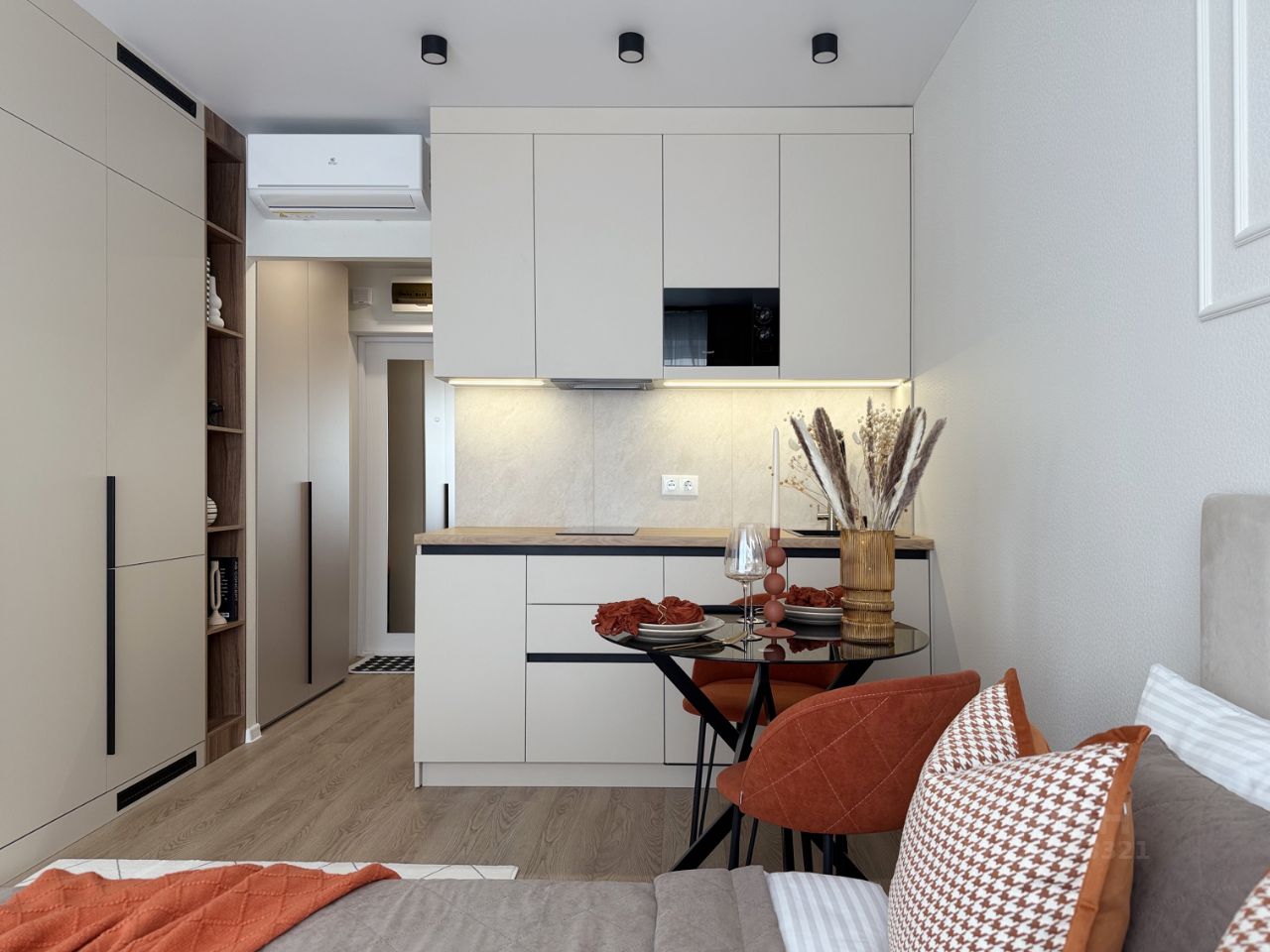 Квартира полностью готова к проживанию. Оснащение: удобная кровать с ортопедическим матрасом и подъёмным механизмом, кондиционер, стиральная машина с функцией сушки, пылесос. Кухня оборудована встроенным холодильником, индукционной варочной панелью, посудомоечной машиной, вытяжкой и чайником.