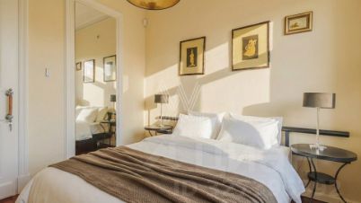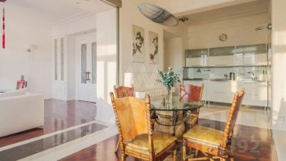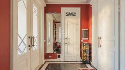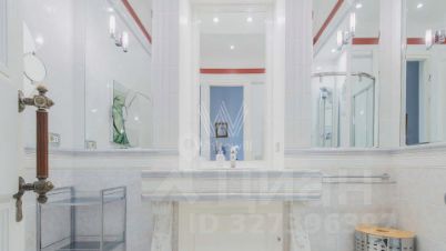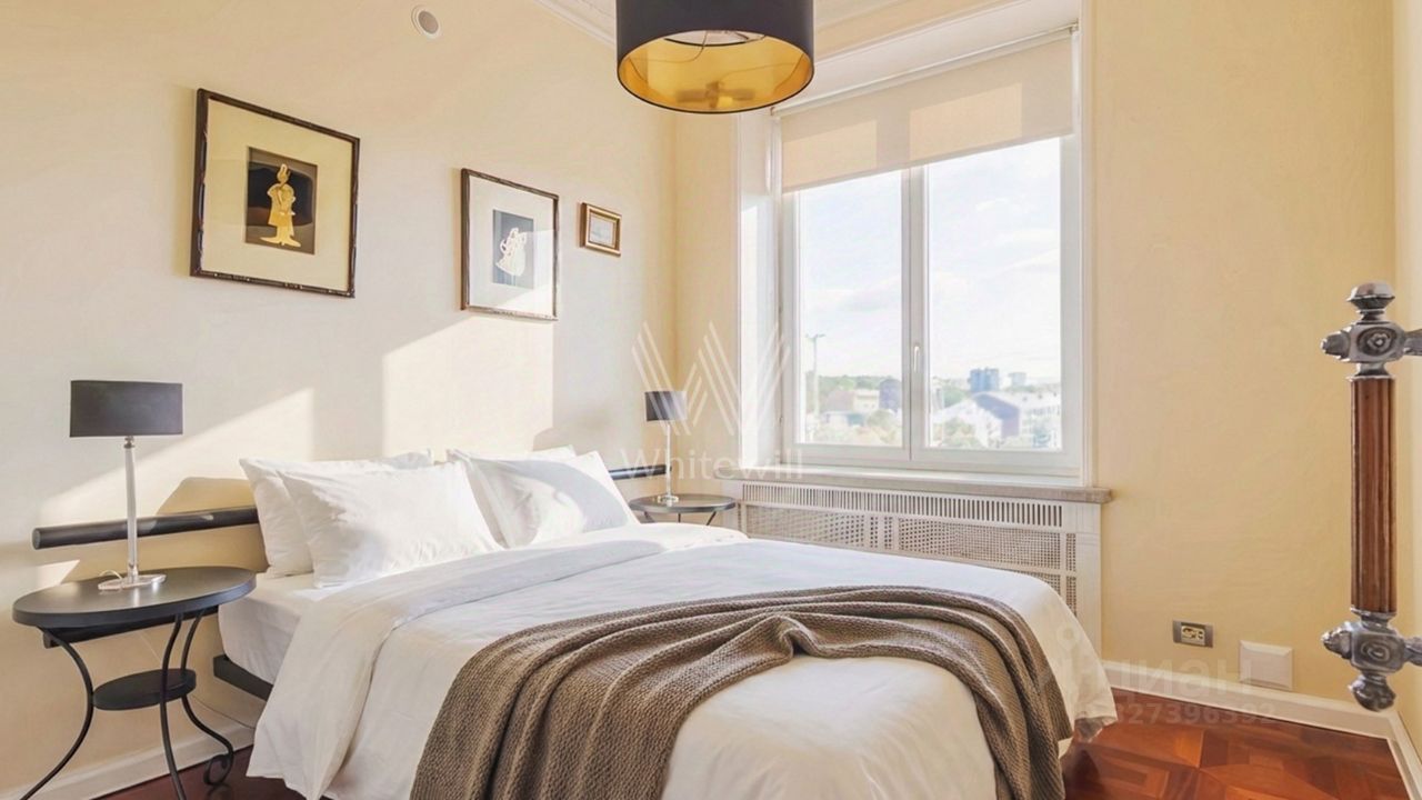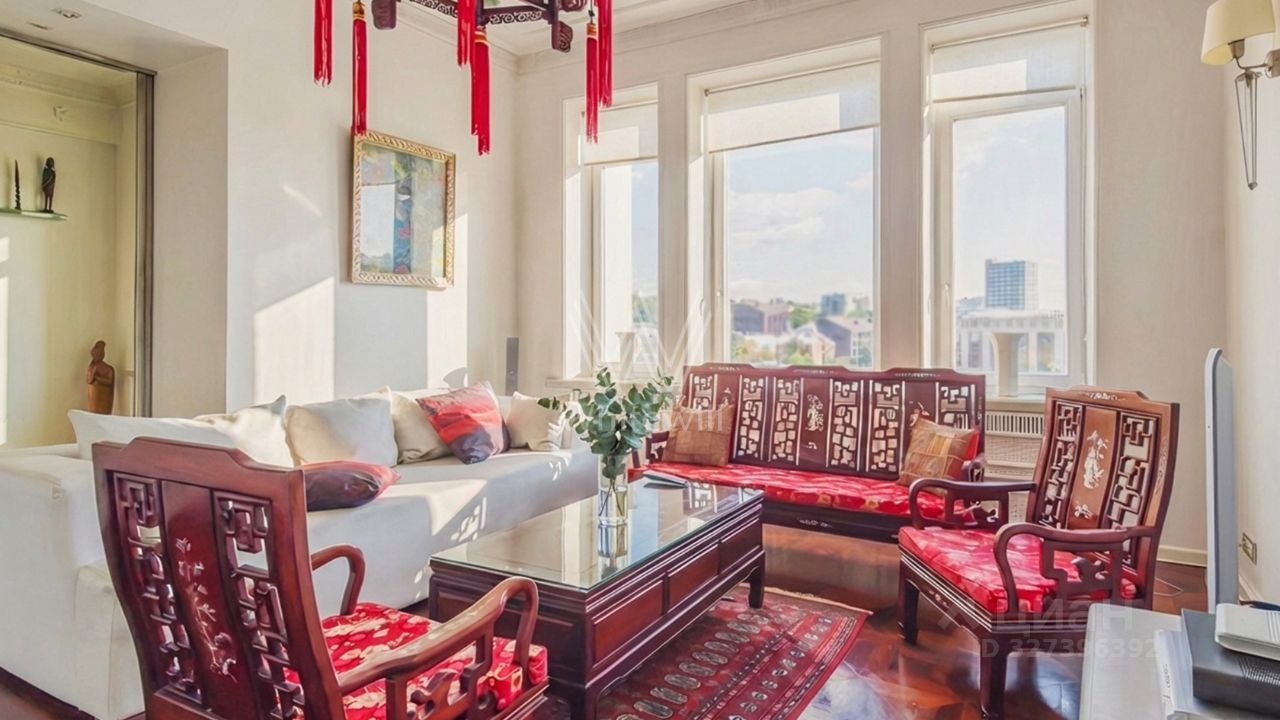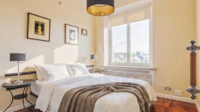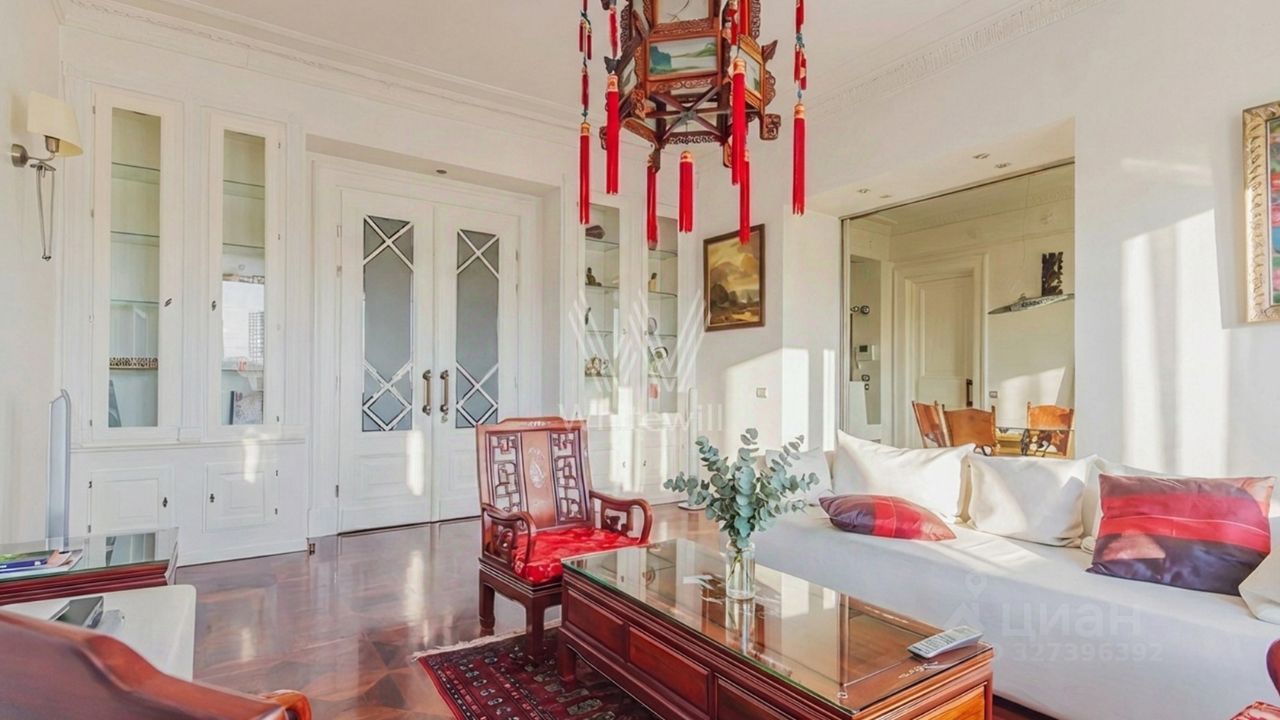 Квартира с 3 спальнями общей площадью 110 м² в знаменитой сталинской высотке на Котельнической набережной. Выполнен дизайнерский ремонт с использованием натурального дерева и камня. На полу выложен паркет и натуральный мрамор с подогревом. Лепнина, двери и паркет изготовлены по точной исторической копии.