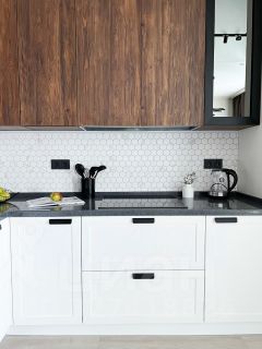 Бытовая техника: холодильник, плита, духовой шкаф, посудомоечная машина, микроволновка, стиральная машина, кондиционеры, телевизор.