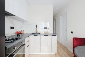 Кухня полностью оборудована новой техникой: холодильник, посудомоечная машина, варочная панель, духовой шкаф.