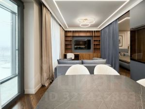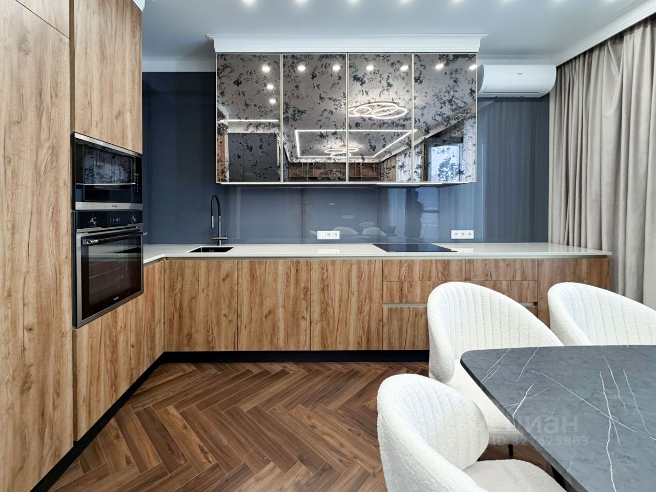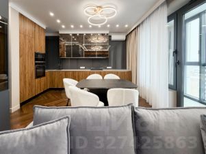 Интерьер выполнен в современной стилистике с использованием премиальных материалов. Пол во всех помещениях покрыт натуральным паркетом, уложенным элегантной елочкой. Потолки оснащены многоуровневым LED-освещением с эффектными кольцевыми светильниками и точечной подсветкой.