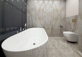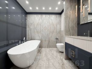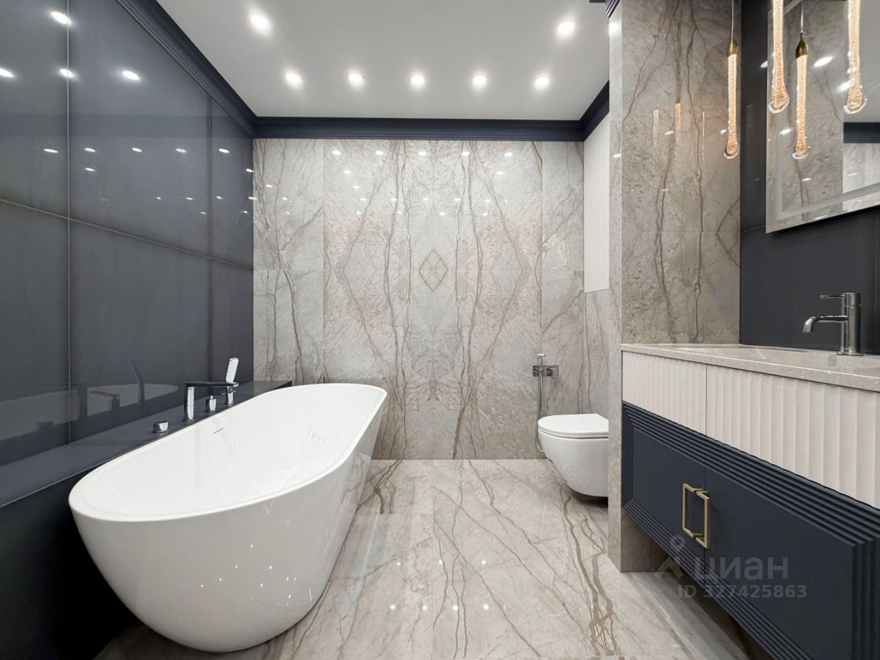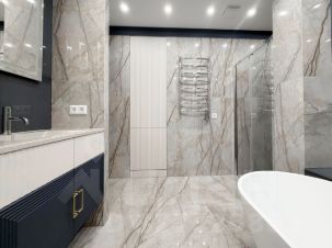 Ванная комната — настоящее пространство для релакса с отдельно стоящей белой ванной, душевой, мраморной плиткой на стенах и полу, подвесной сантехникой и вместительной тумбой с зеркалом.