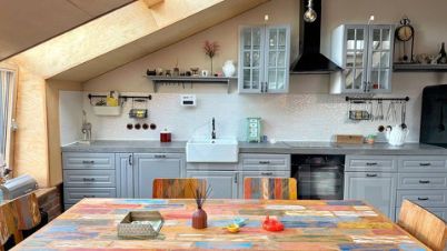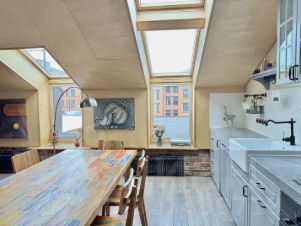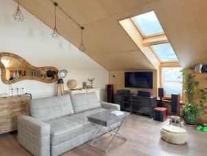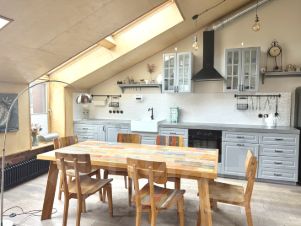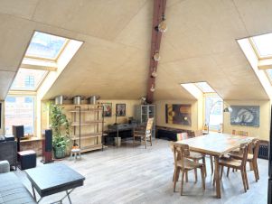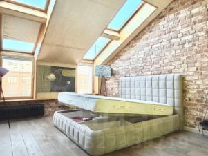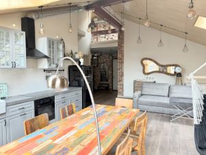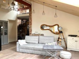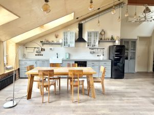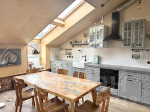 Очень высокий потолок до 5.5 метров, завышенная высота дверей, японская фанера, бетон, кирпич, немецкий массив дуба Monblane, сантехника Villeroy&Boch, Blanco, смесители Hansgrohe, столовая из тика Teakhouse, мебель Италия, премиум матрасы.
