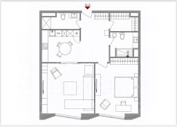 Планировка включает в себя: гостиную, кухню, просторную спальню, с/у с душевой кабиной, оборудованную гардеробную, гостевой санузел, просторный холл.