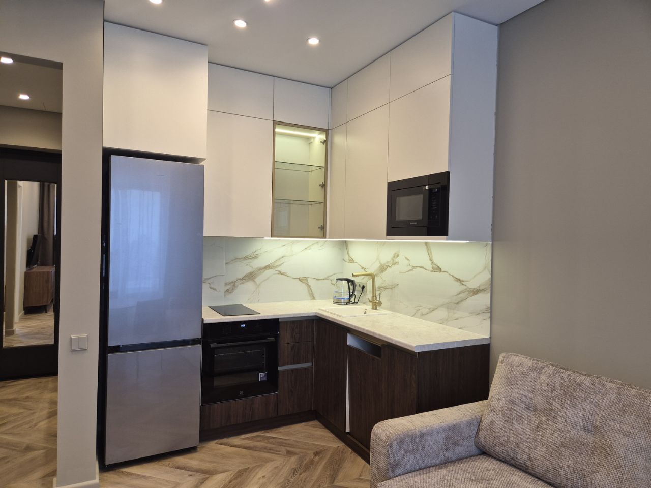 Просторная кухня-гостинная, полностью укомплектована качественной бытовой техникой: холодильник, посудомоечная машина, плита с духовым шкафом, телевизор. Полноценный санузел со стиральной-сушильной машиной, гардеробная.