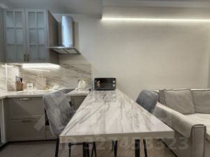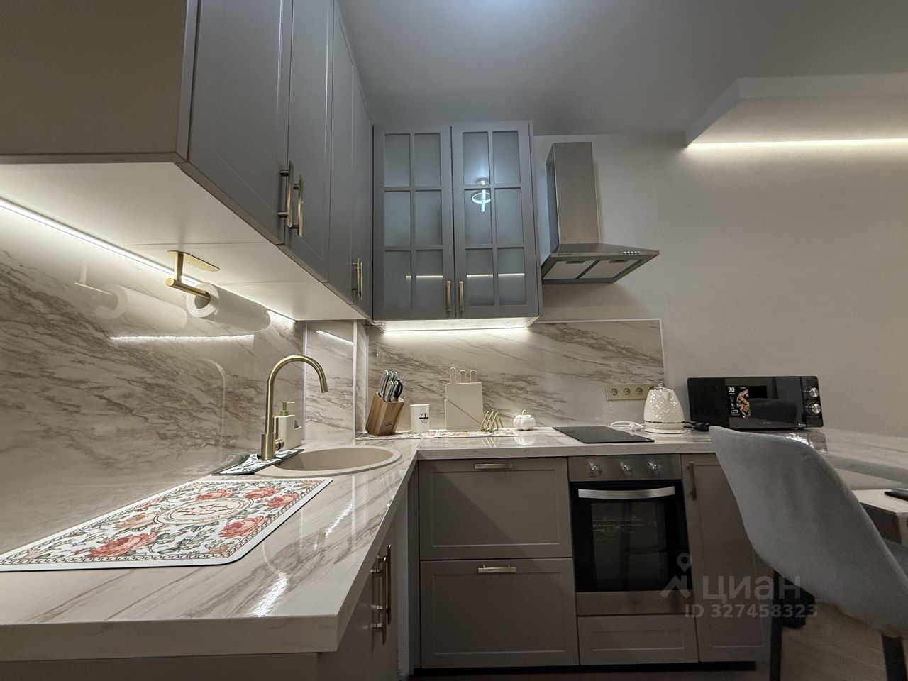 Кухонная зона: стильный кухонный стол с мраморной столешницей и удобными барными стульями. Вместительные шкафы для хранения посуды и продуктов. Установлена микроволновая печь.