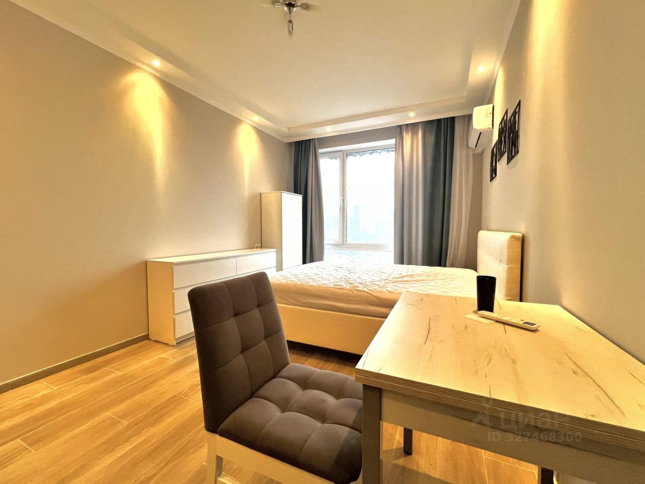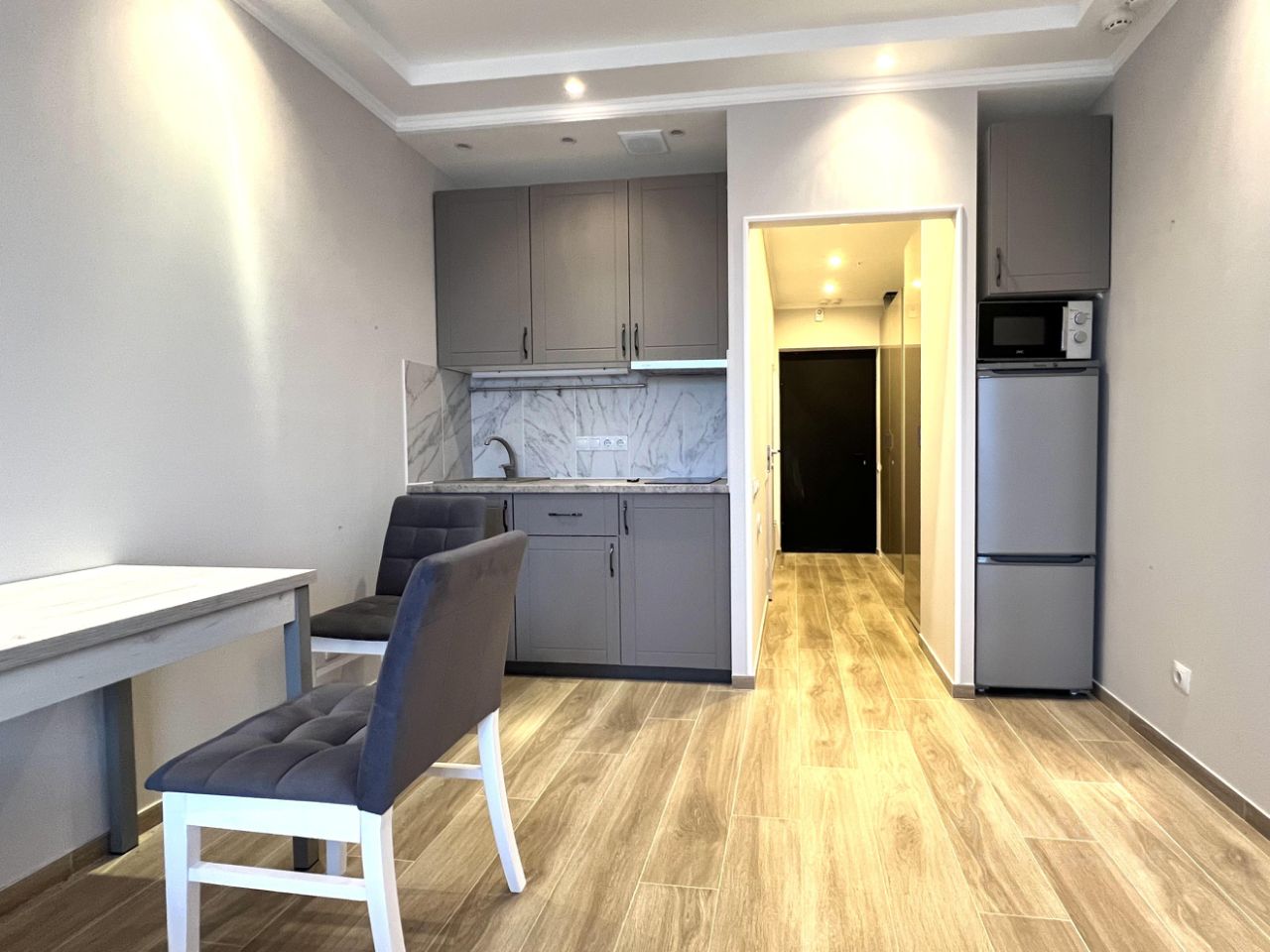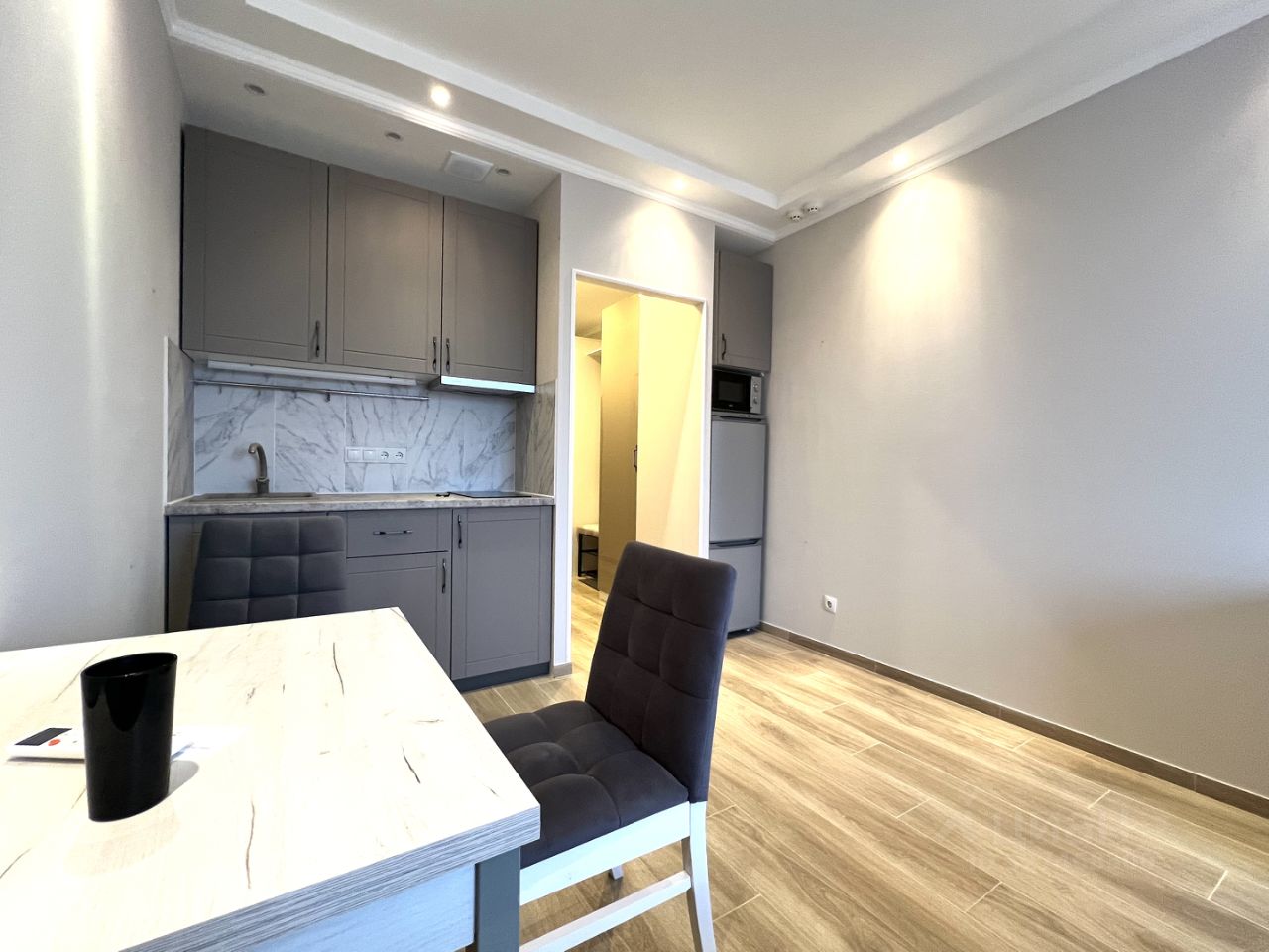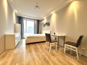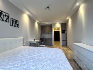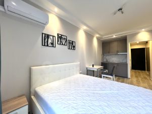 Студия полностью готова для комфортного проживания: здесь сделан евроремонт, установлена современная мебель как на кухне, так и в жилой зоне. В квартире есть вся необходимая техника: кондиционер, холодильник, посудомоечная и стиральная машины. Ванная комната оборудована полноценной ванной.