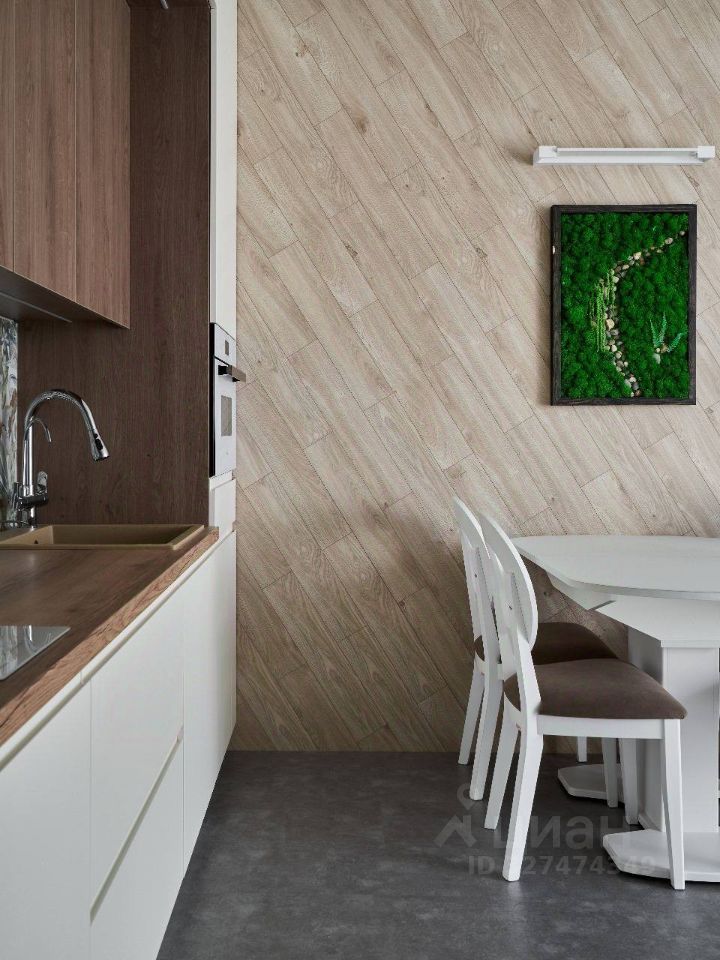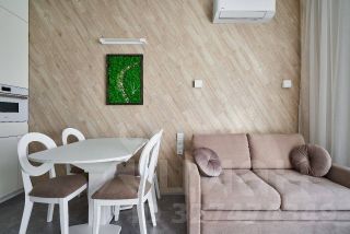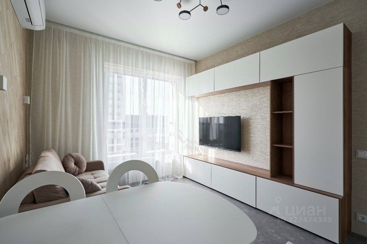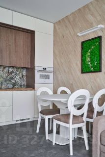 В кухне-гостиной: встроенная кухня с качественной фурнитурой, электрический духовой шкаф с функцией СВЧ, посудомоечная машина, индукционная варочная панель, вытяжка, встроенный холодильник, система фильтрации питьевой воды, обеденный гарнитур. В зоне отдыха: диван, смарт ТВ (50 дюймов), стенка с удобными шкафами и ящиками.