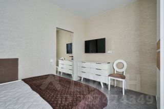 В спальне: большая двуспальная кровать с ортопедическим матрасом, комод для хранения вещей, вместительный шкаф-купе, смарт ТВ (43 дюйма), письменный стол, пункт беспроводной зарядки рядом с кроватью.