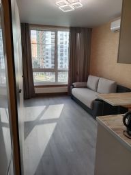 Сдаётся уютная студия в новом доме. Сделан современный ремонт, есть вся необходимая для жизни мебель и техника. До метро 7 минут пешком. Рядом с домом есть вся необходимая инфраструктура. Студия свободна и готова к заселению.