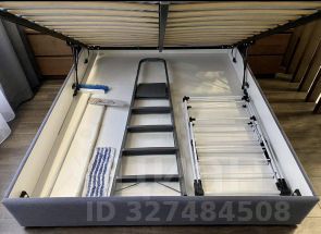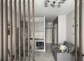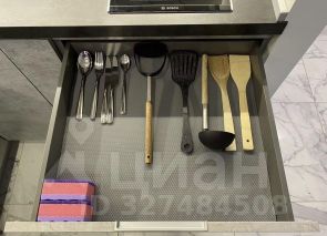 Полностью оборудованная кухня: холодильник, посудомоечная машина, микроволновка, плита, духовой шкаф, чайник, посуда, стол и два стула. В спальне двуспальная кровать с подъемным механизмом и местом для хранения, прикроватные тумбочки и комод. В гостиной зоне — диван. В прихожей большой встроенный шкаф.