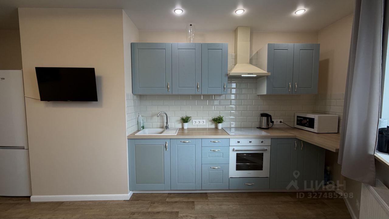 холодильник, духовой шкаф, посудомоечная и стиральная машины, телевизор, обеденная зона, установлен двуспальный раскладной диван.