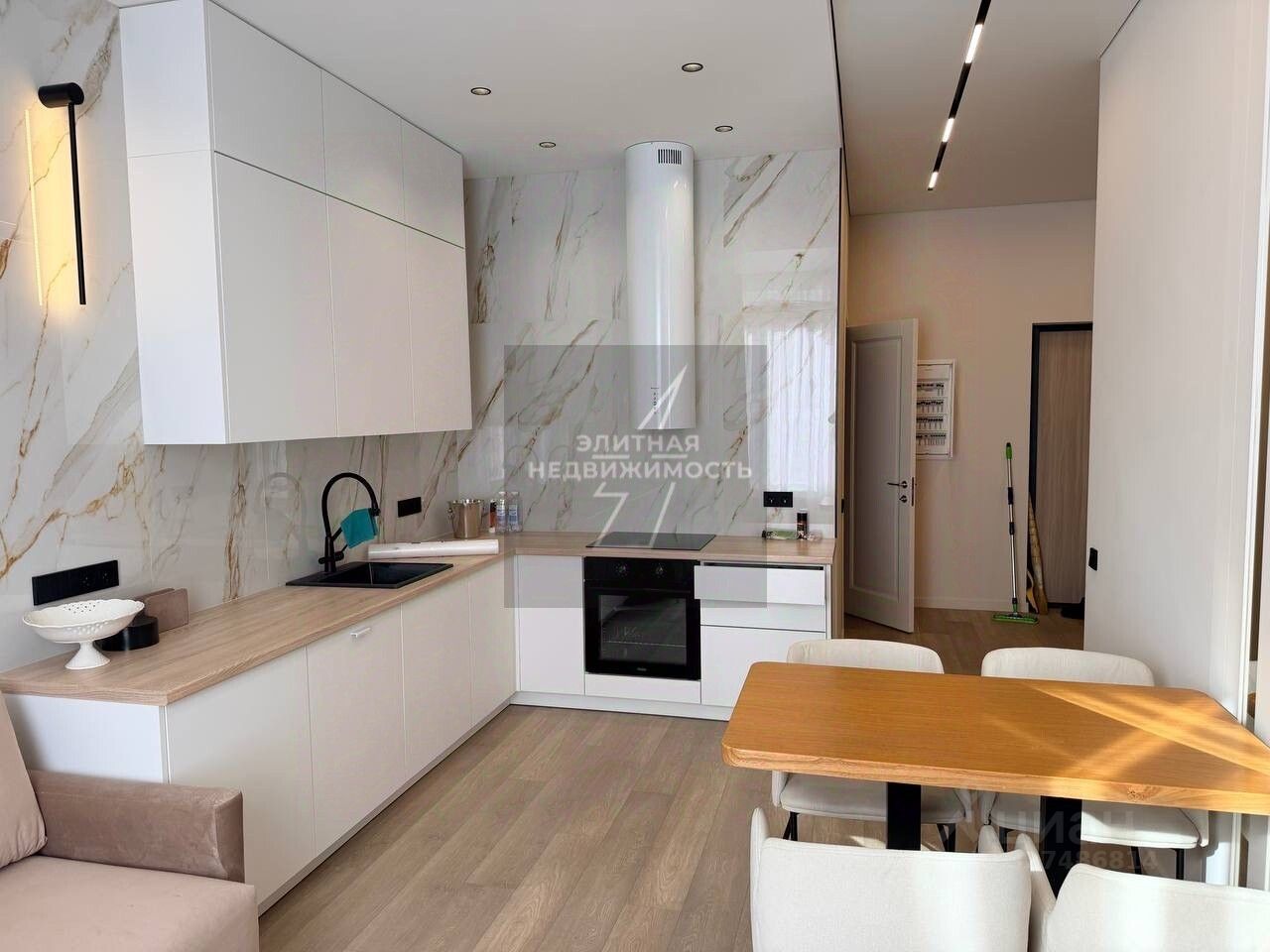 Светлая кухня-гостиная, на кухне, встроенная техника, в гостиной большой теливизор и удобный диван.