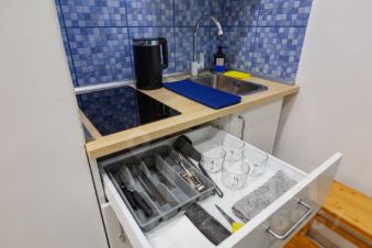 - мини-кухня: варочная поверхность, холодильник, микроволновка, полный набор посуды и кухонных принадлежностей
