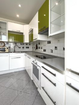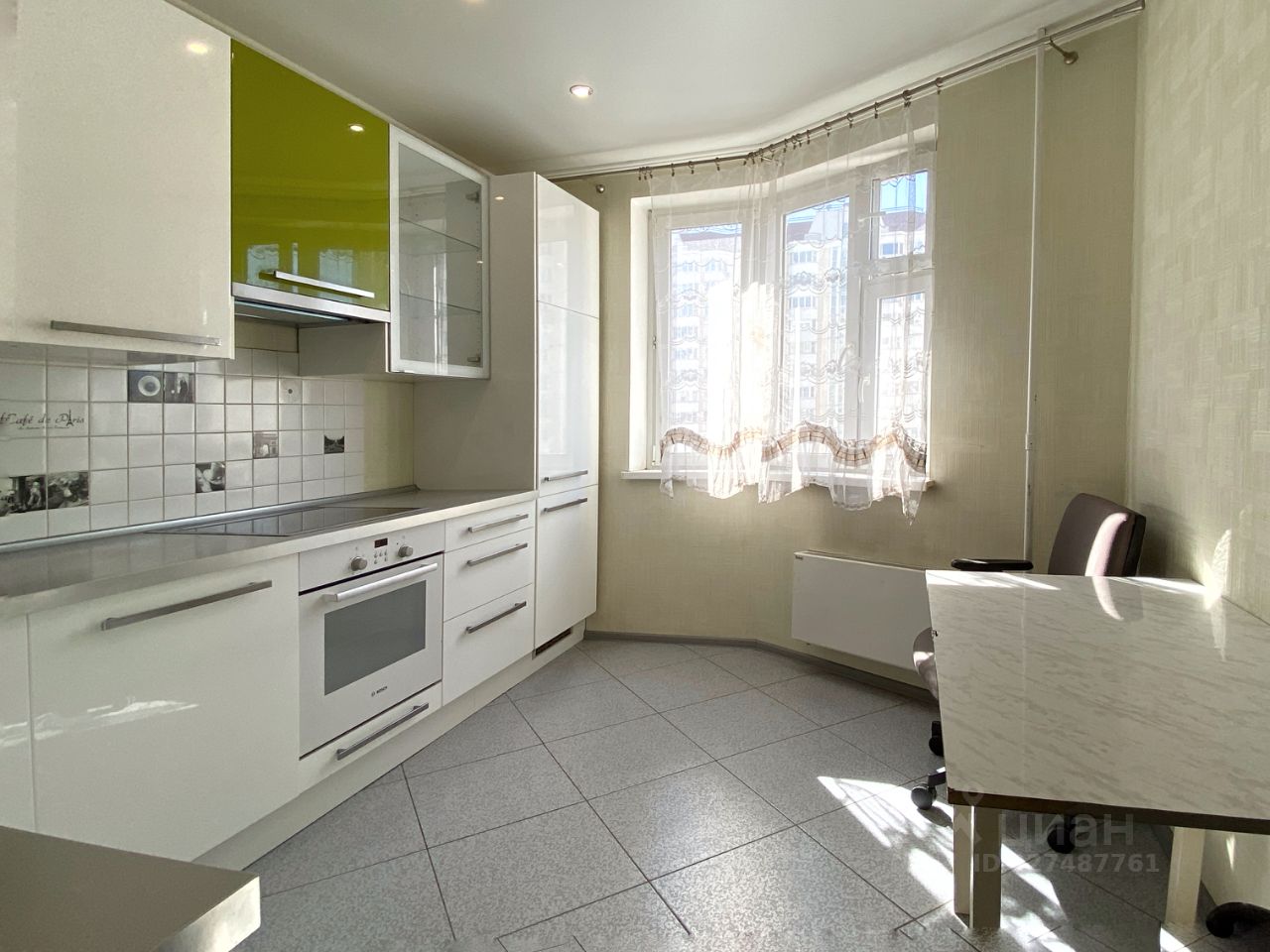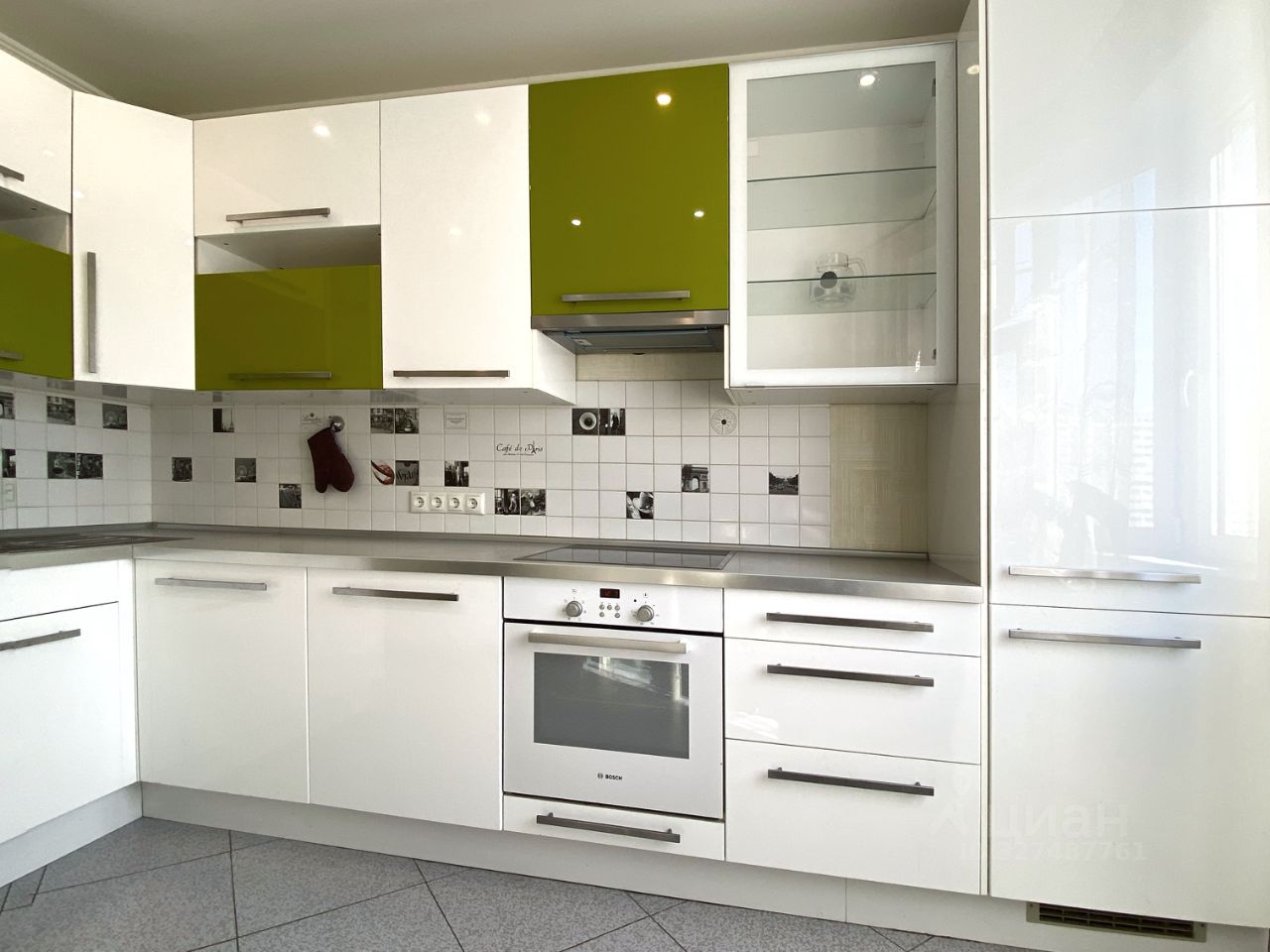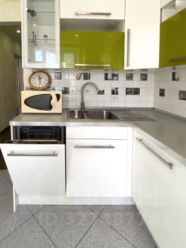 Ну кухне установлен угловой кухонный гарнитур со встроенной техникой: